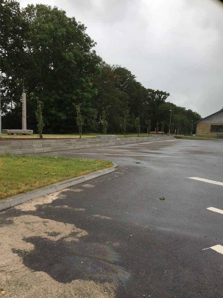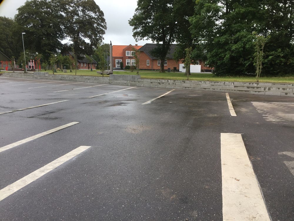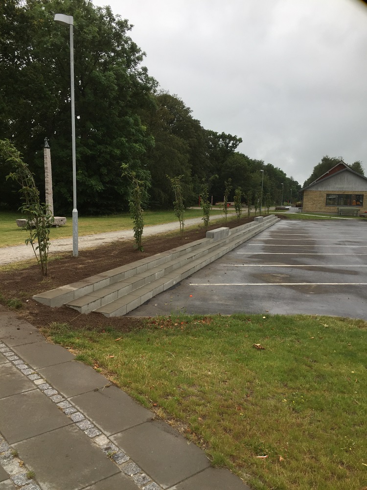 Trappeanlæg med siddemoduler.Asfalt og opstregning.Teglbelægning og plantebede. udført af HJ Have & Anlæg ApS